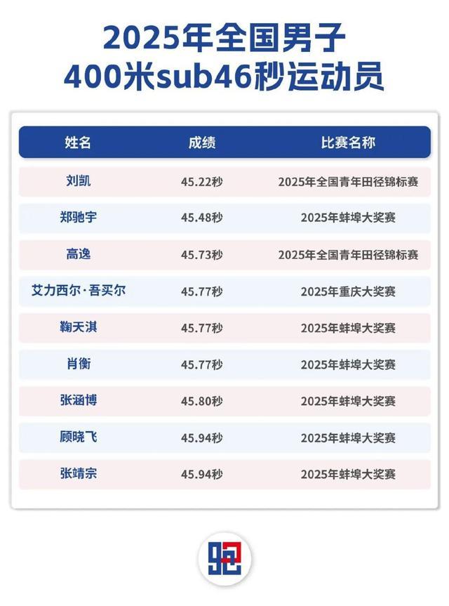 七月份之前,全国就有9人打开了46秒大关,创下全国男子400米单赛季之最。距离全运会还有几个月的时间,全国男子400米的进步势头令人欣喜。
