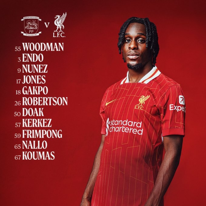 利物浦下半场阵容:56-伍德曼、3-远藤航、9-努涅斯、17-柯蒂斯-琼斯、18-加克波、26-罗伯逊、50-本-多克、57-科尔克兹、59-弗林蓬、65-纳洛、67-库马斯