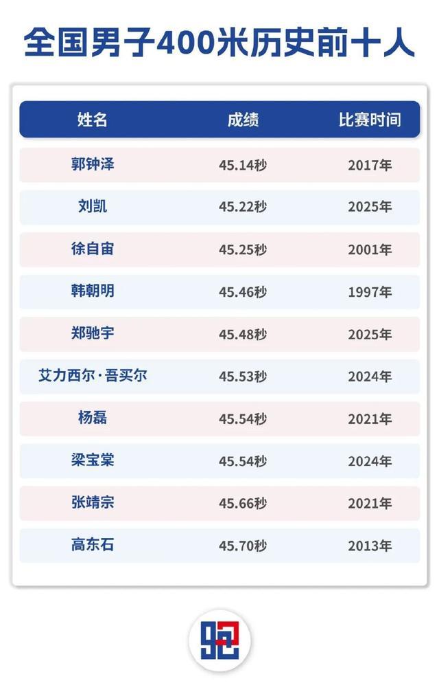 1993年北京全运会赵存林以45.85秒成为全国第一位400米打开46秒大关的选手,再到2017年天津全运会郭钟泽以45.14秒打破全国纪录。